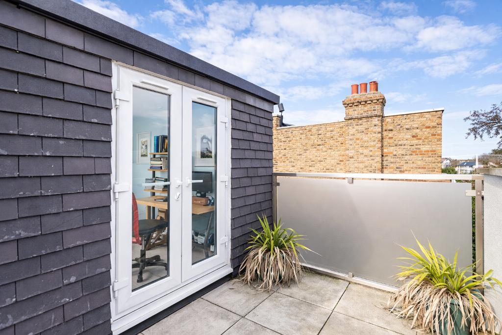 The top floor provides two additional rooms, including a large bedroom and a further room currently arranged as a study, offering flexibility as a fifth bedroom, nursery, or home office. This floor also benefits from useful eaves storage and access to a private balcony.