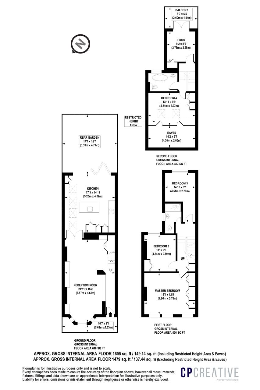 The top floor provides two additional rooms, including a large bedroom and a further room currently arranged as a study, offering flexibility as a fifth bedroom, nursery, or home office. This floor also benefits from useful eaves storage and access to a private balcony.