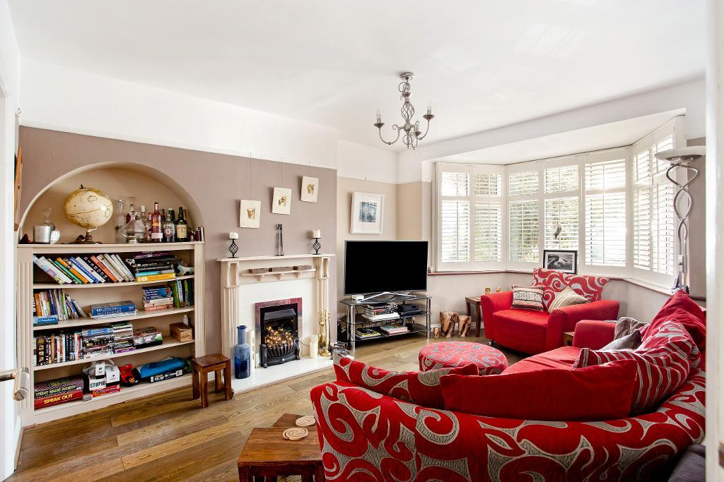 The welcoming entrance hall features elegant oak flooring, bespoke storage and a staircase with attractive wooden balustrades. To the front, the stylish reception room boasts a bay window with plantation shutters, feature fireplace, built-in cabinetry and high ceilings, creating a warm yet refined living space. Glazed panel doors lead seamlessly through to the heart of the home.